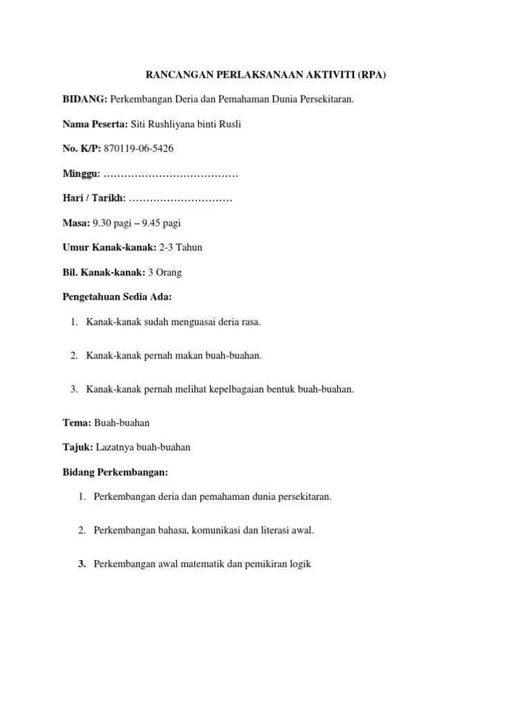 Pelaksanaan aktiviti (rpa) bidang : Perkembangan bahasa, komunikasi dan literasi awal (bkla). Sebenarnya, untuk rpa pemakanan, objektif utamanya ialah untuk nak .